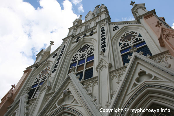 The building is an arresting sight as it boasts of elaborate Gothic features. Both its sides are lined with stained-glass windows and there are Mandarin characters, a legacy of the influence of its early parishioners.